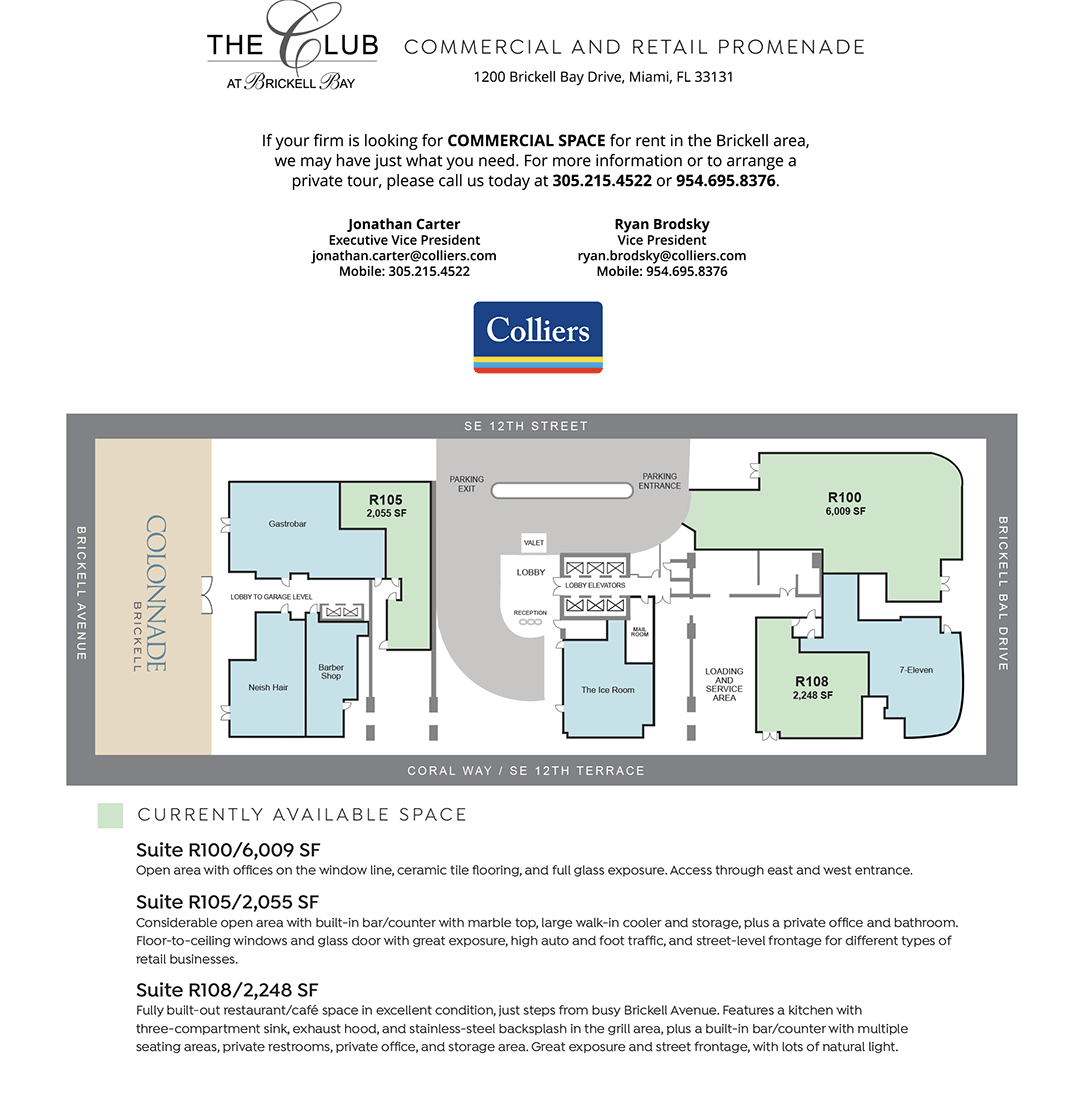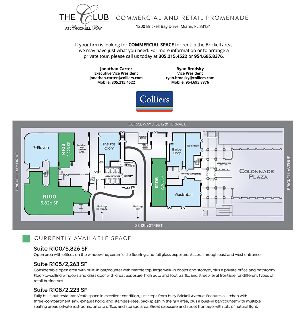 A masterpiece of urban living, The Club at Brickell Bay is a 643-unit luxury high-rise condominium with exceptional commercial and retail opportunities on the ground floor. Located at the center of Miami’s financial district, between famed Brickell Avenue and Biscayne Bay (adjacent to FECR’s Colonnade Plaza), highly coveted neighborhood demographics make this an ideal place to operate first-class retail or restaurant space.
